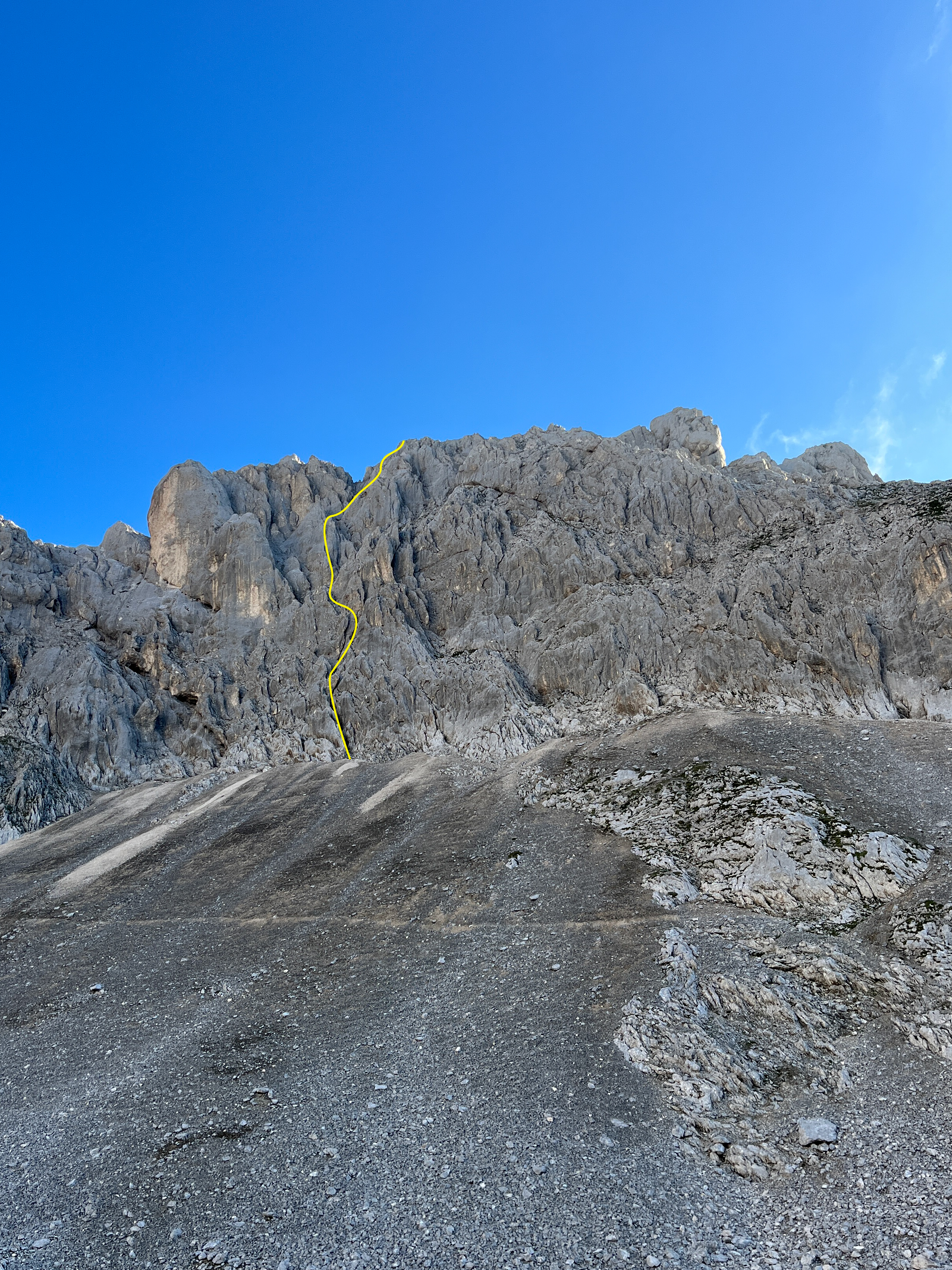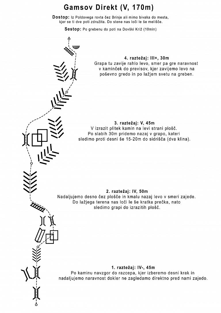 Pristop do bivaka II in po poti proti Oltarju in nato do izrazitih kaminov na desni nad plazišči. Do tja vodijo manjše stezice.
